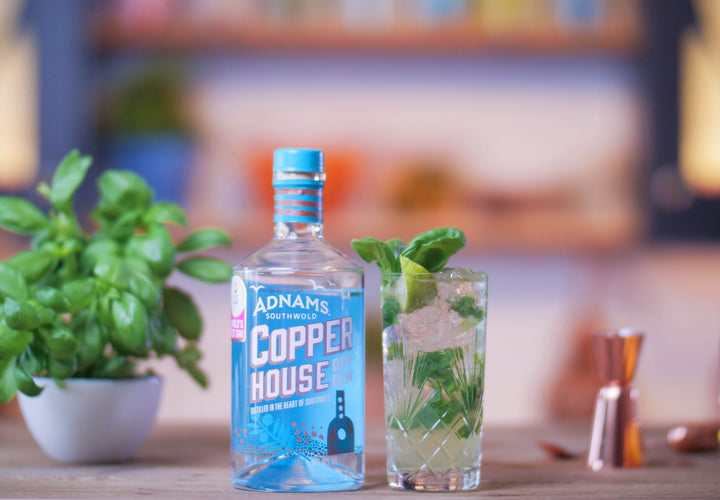To your highball glass, add Copper House Dry Gin and basil then muddle together.