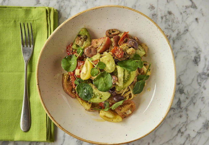Heritage tomato, semi-dried olive and artichoke linguine, watercress and salsa verde