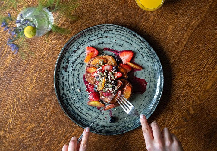 Plate the pancakes and add the poached fruits. To garnish, sprinkle toasted seeds to provide that extra crunch.