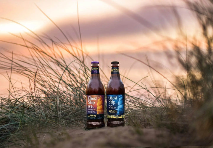 For Ghost Ship Pale Ale, the whole scene is brighter and lit by the moonlight, whereas for Ghost Ship 0.5%, the light is on the sky and the sails, while the dunes and the shore begin to fall into shadow, as the setting sun drops to the horizon.