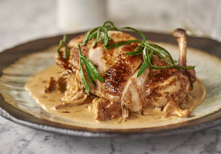 Add the stock and reduce by two thirds. Add the cream and reduce by one third. Finish with a small glug of truffle oil and a squeeze of lemon juice. Spoon the fricassee into the centre of a plate or bowl. Top with the sliced chicken breast. Serve with steamed greens or some delicious sea vegetables and pair with our best-selling White Burgundy.