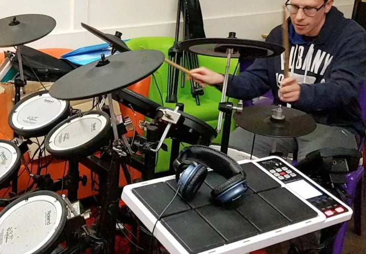It was clear to see (and hear) that the musical sessions were full of joy and laughter. The workshop provided guided tuition in a variety of instruments including electric, acoustic and bass guitars, drums, percussion, keyboards, vocals and also song-writing.